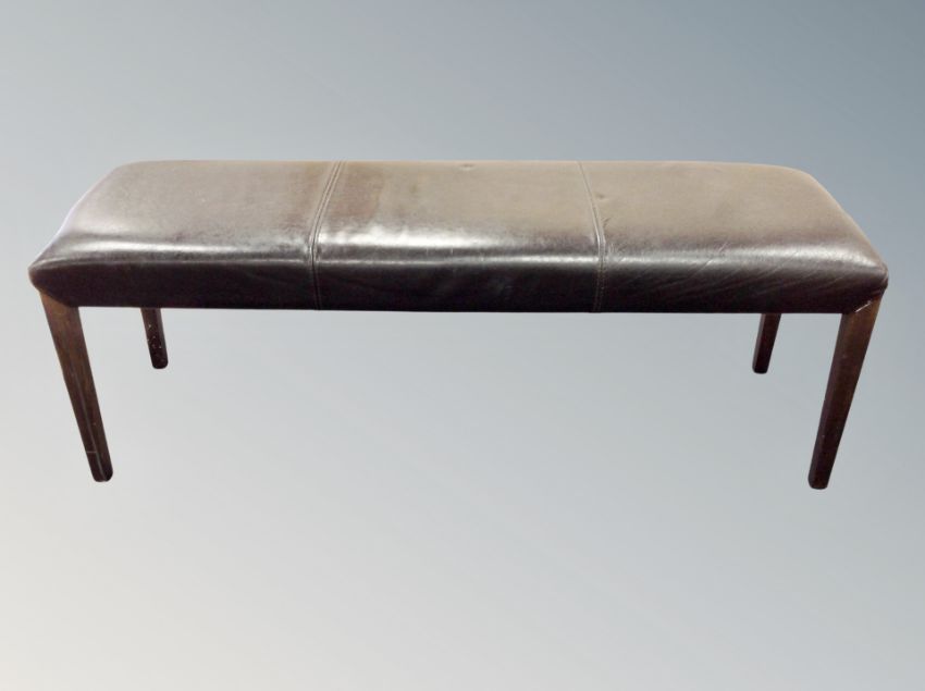 A pair of stitched brown leather three seater benches width 140 cm