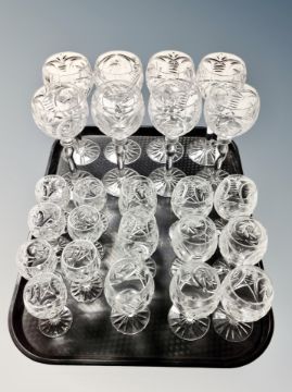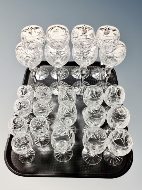 A set of eight cut glass wine glasses and sixteen further smaller glasses