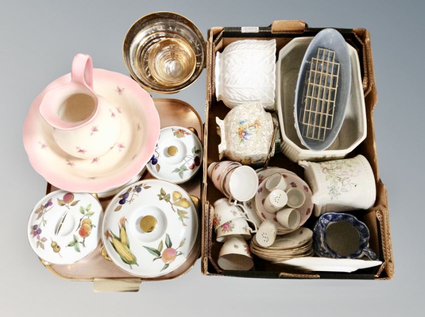 A box and tray of china, jug and basin, Evesham Worcester ceramics etc