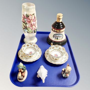 A tray of ceramics, Goebel figures, Nao duck ornament, Maling Dahlia vase, Bells Christmas 1989 decanter, pair of Paragon china cups and saucers