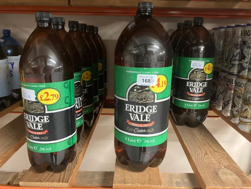 Fourteen bottles of Eridge Vale Cider : 8 x 3 litre bottles and 6 x 2 litre bottles. (14) CONDITION REPORT: These cans are salvage stocks. Best Before Date not known. Due to licensing restrictions this lot will not be on public view in the saleroom.