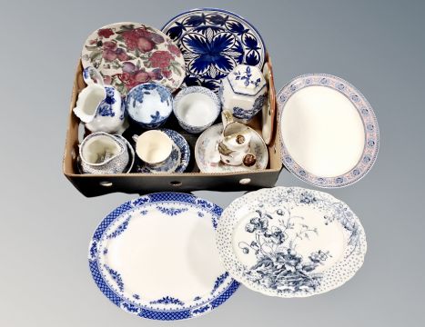 A box of 19th century and later ceramics including blue and white meat plates, Palissy oversized cup and saucer, wall plates etc