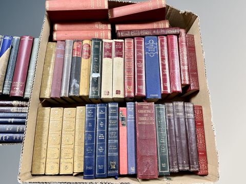 Two boxes of 20th century leather bound volumes to include Classics, works of Oscar Wilde, Poetry etc