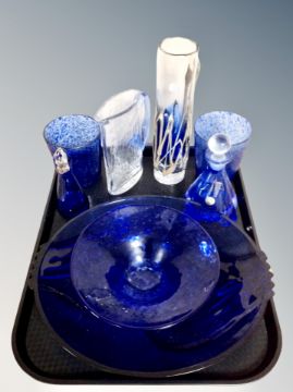 A tray of coloured glass, blue glass continental bowl, coloured art glass