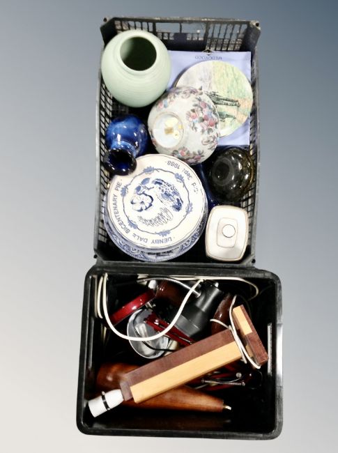 Two crates of 20th century wooden ceramic and angle poise table lamps, ceramics plates, vases etc