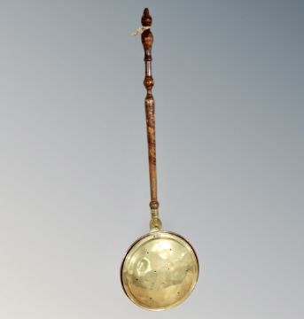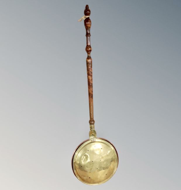 A 19th century copper and brass beech-handled bed warming pan, set of Turner's 10 x 50 field glasses in case and a Canon Isus digital camera