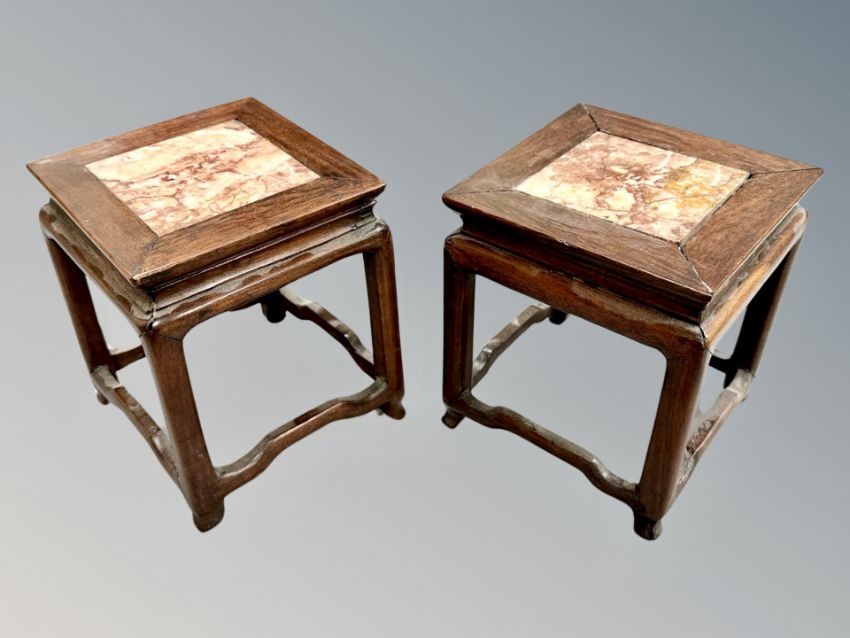 A near pair of Chinese miniature marble topped hardwood stands, height 14cm