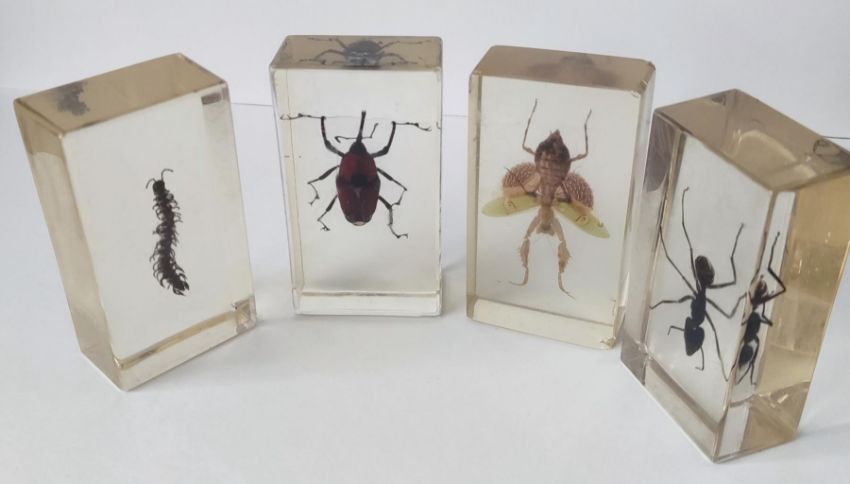 A collection of insects in resin blocks - Japanese Carpenter ant, Flower Mantis, Red Snout Weevil etc