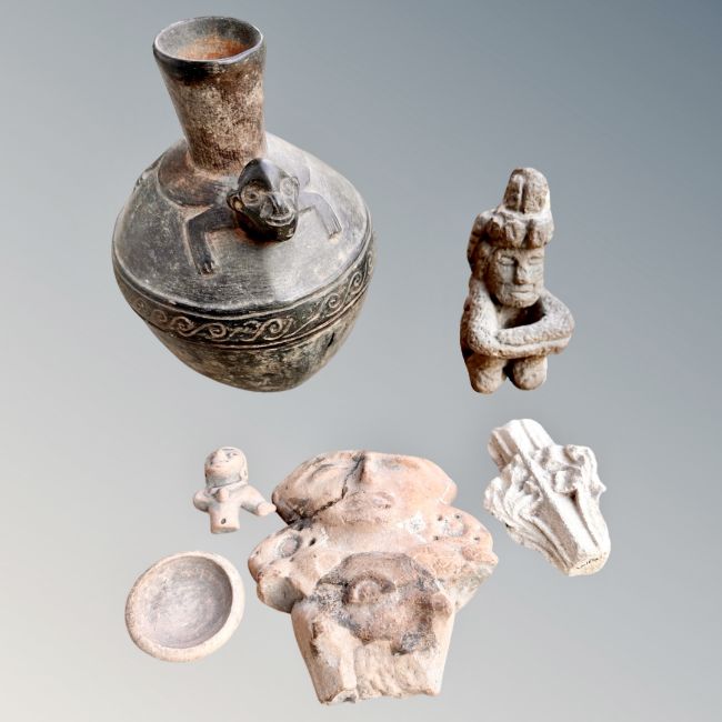 A Pre-Columbian type stoneware vessel (height 19cm) and other objects