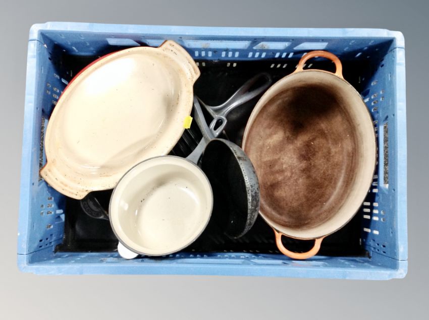 A box of four cast iron and ceramic Le Creuset pans and oven dishes