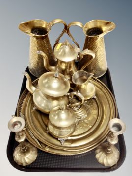 A tray of brass plaques, pair of jugs etc