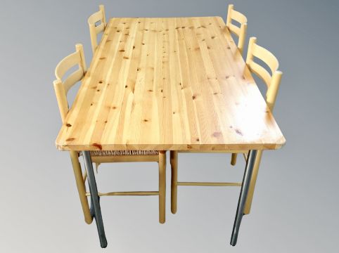 A contemporary pine dining table and four chairs with rattan seats