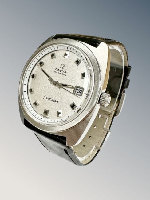 A gent's stainless steel Omega Seamaster automatic centre seconds calendar wristwatch, circa 1969, with metallic-silver dial, Omega crown, screw off case back with Seamaster emblem, twenty-four jewel calibre 585 movement numbered 31,447,760, case 38mm, on Omega black leather strap with Omega buckle.