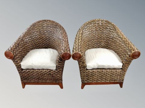 A pair of wicker conservatory armchairs