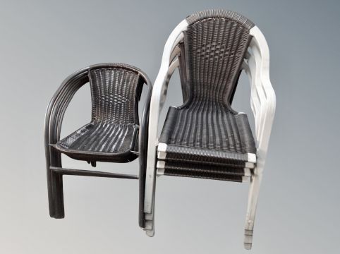 Two sets of four stacking garden arm chairs and a further wicker chair