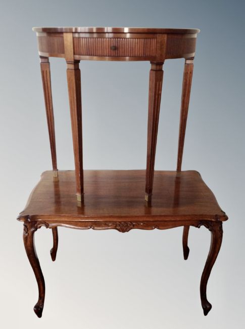 A walnut coffee table on cabriole legs together with a further demi lune table