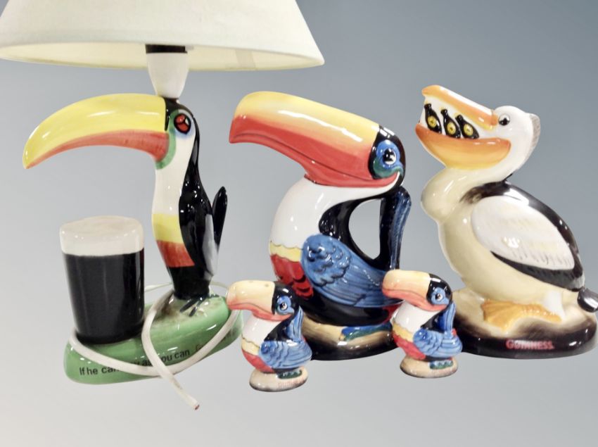 Two Guinness Toucan money boxes, similar pair of salt and pepper sifters, copy of a Carlton ware Guinness Toucan lamp