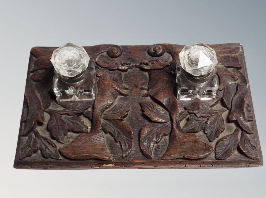 A 19th century carved oak desk stand with two glass inkwells
