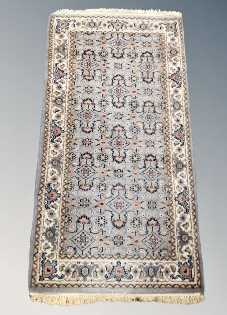 A fringed Iranian rug on pale blue ground 148 cm x 74 cm