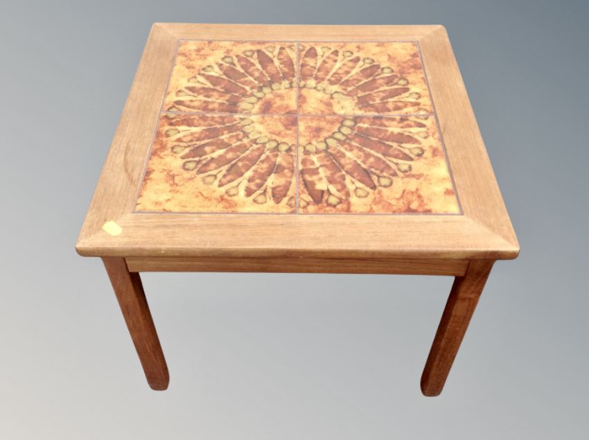 A Danish teak tiled square coffee table together with further rectangular coffee table