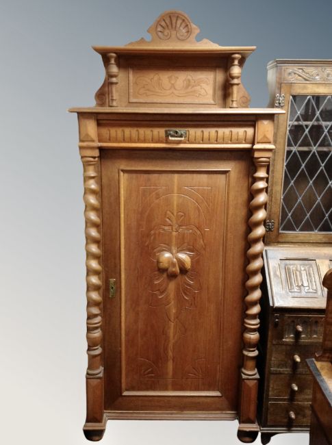 A 19th century oak sentry door cabinet with barley twist supports width 86 cm