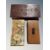 A carved oak bridge box with contents, box of old chequers, spool box and antique signal lantern housing