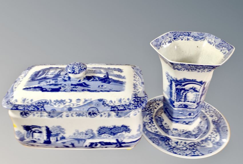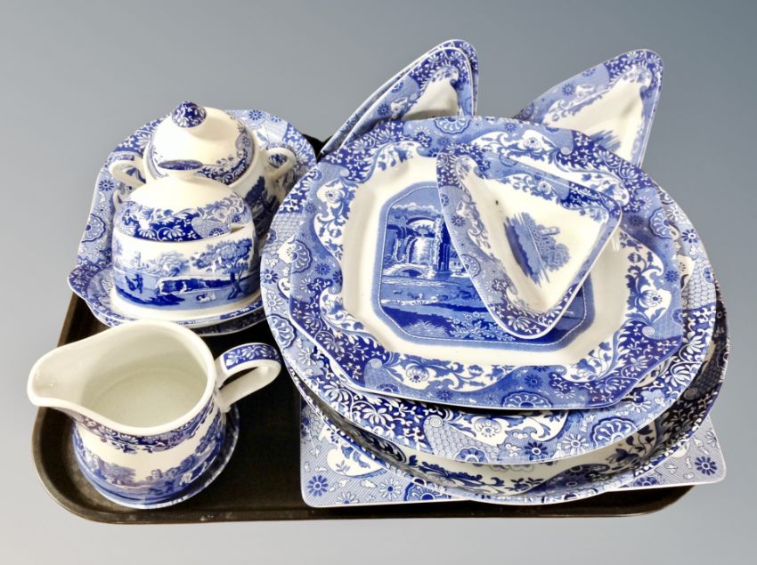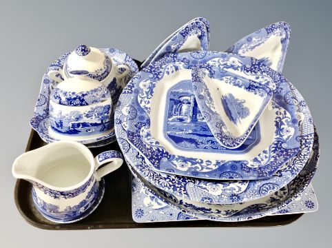 A collection of Spode Italian blue and white porcelain, plates, tea pot, planters etc