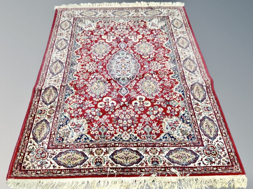 A machine made rug of Persian design on red ground, 220 cm x 142 cm