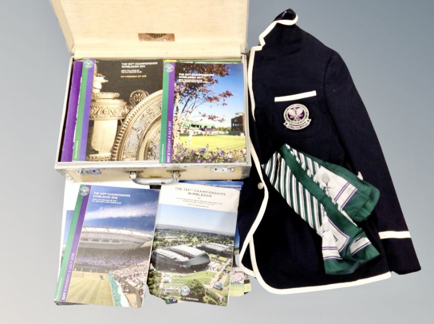 A vintage suitcase and crate containing Wimbledon programmes and related clothing