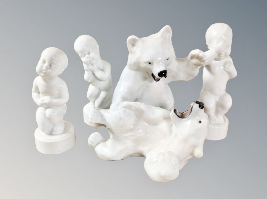 A Royal Copenhagen figure group of two fighting polar bears, height 14 cm together with three Bing & Grondhal figures of babies