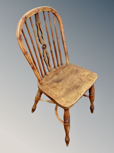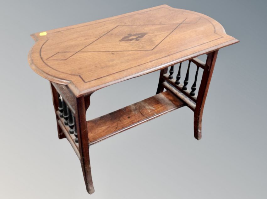 An elm spindle backed chair with crinoline under stretcher together with a two tier occasional table