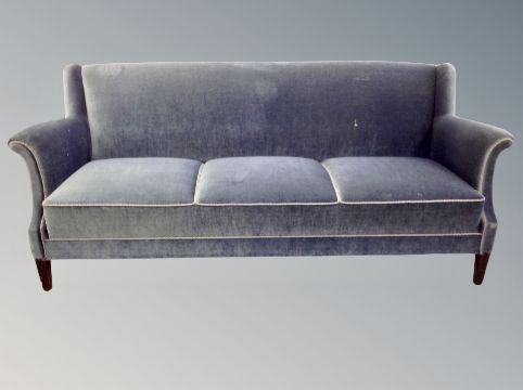 An early 20th century three seater settee in blue dralon, length 190 cm