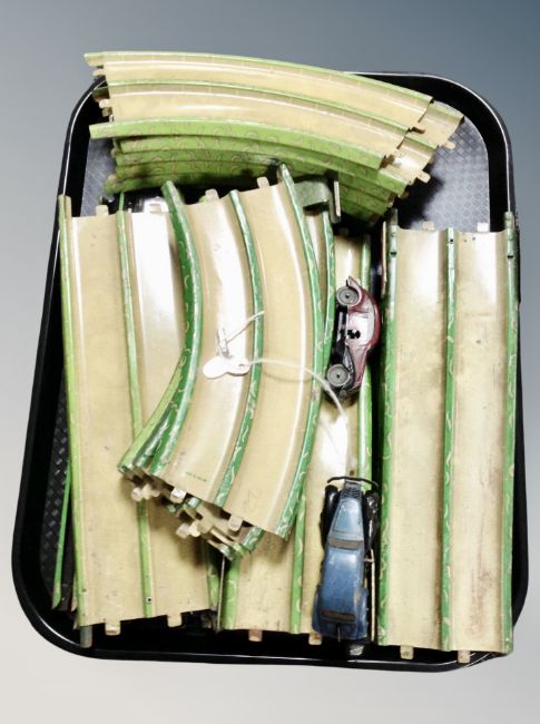Two mid century tin plated wind-up racing cars and a quantity of track