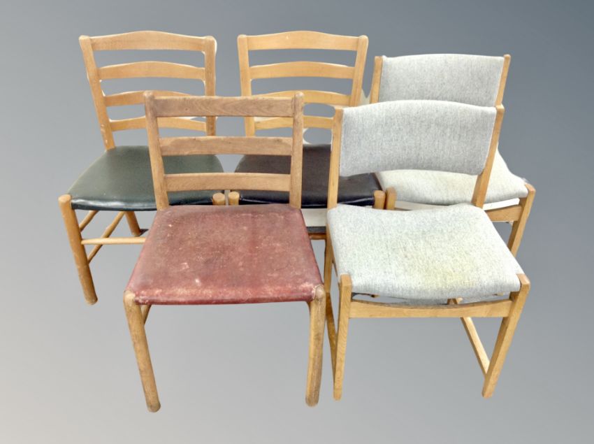 A pair of Danish blond oak chairs in grey upholstery together with three further single chairs