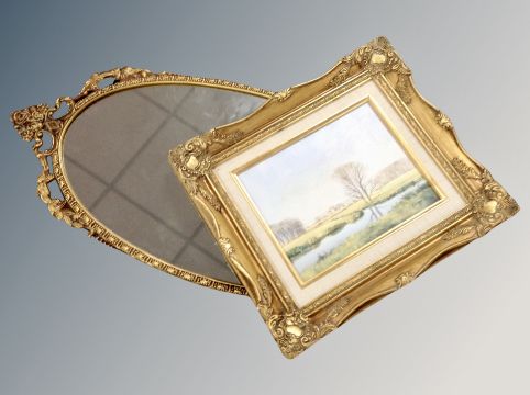 A contemporary gilt oval mirror together with a gilt framed oil on canvas- landscape signed Morris