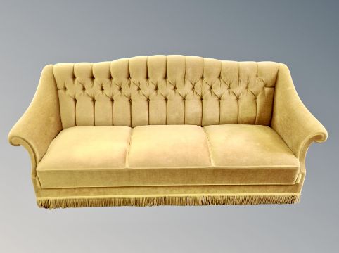 An early 20th century three seater settee in olive green tasseled and buttoned fabric, length 206 cm