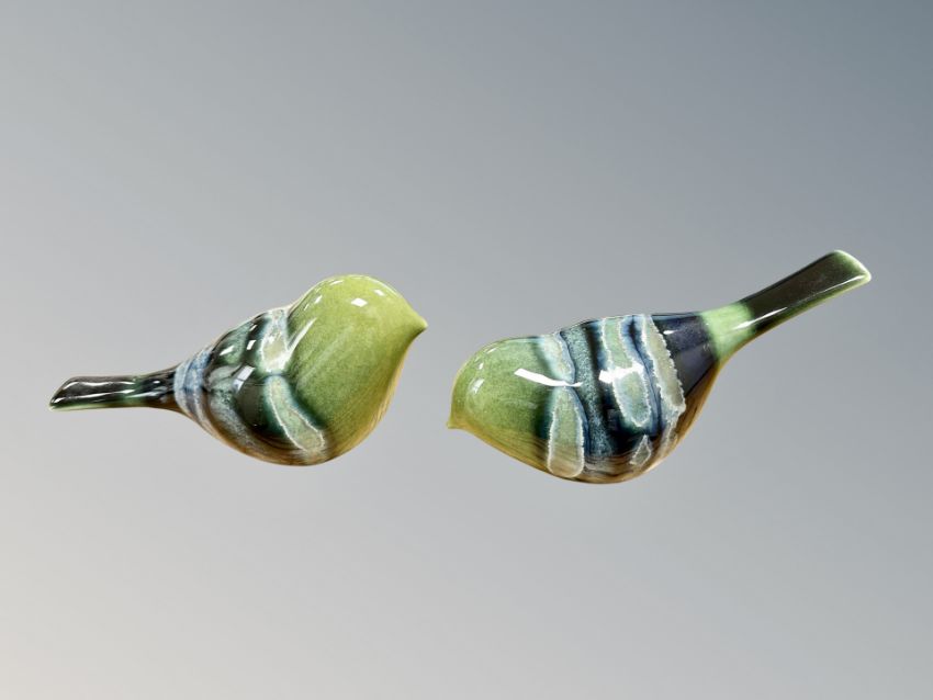 Two Poole pottery Maya bird ornaments, length 14cm. (2)
