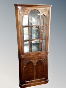 A carved oak glazed standing corner cabinet