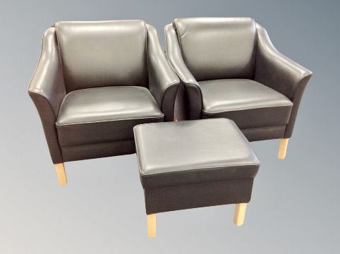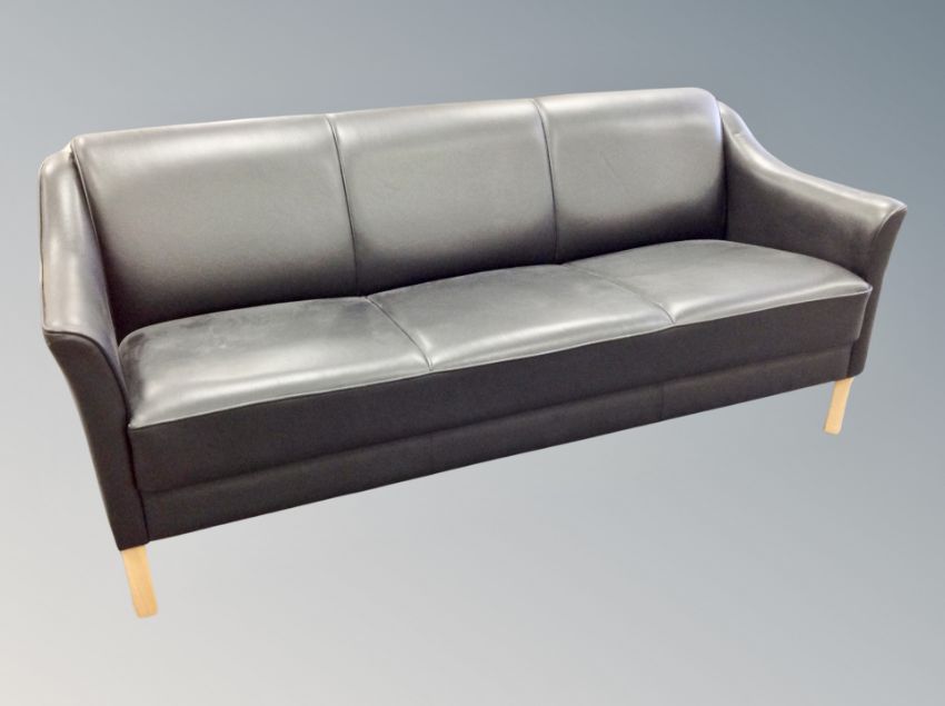 A Danish contemporary black leather four piece lounge suite comprising of three seater settee, pair of armchairs and footstool