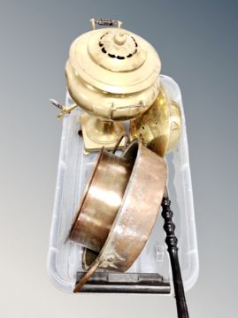 A brass samovar, bed warming pan and two 19th century copper cooking pots