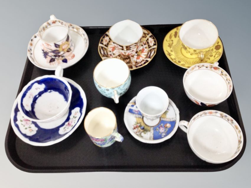 Two Royal Crown Derby tea cup and saucers, Royal Winton coffee can, other tea cups etc