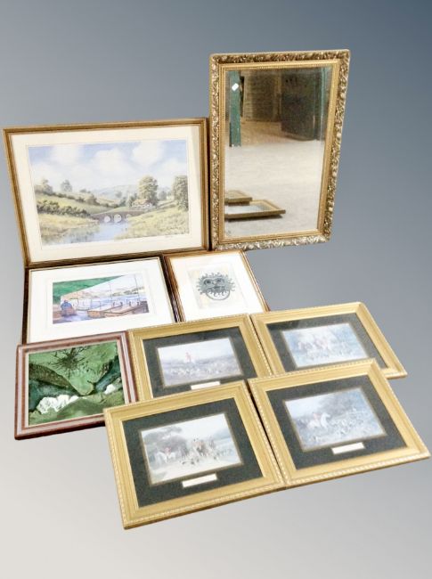 A group of gilt framed pictures and a mirror, set of four fox hunting prints after Hayward Hardy