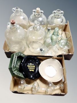 Two boxes of glass, carboys. glasses, ceramic ashtrays etc
