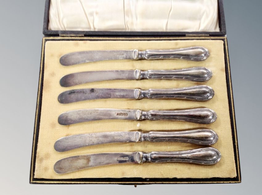 A cased set of six silver handled butter knives
