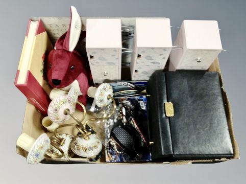 A box of contemporary leather jewellery box, two ceramic twin branch light fittings, costume jewellery, contemporary storage boxes