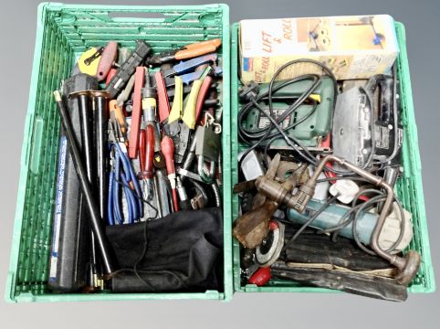 Two crates of power tools and hand tools