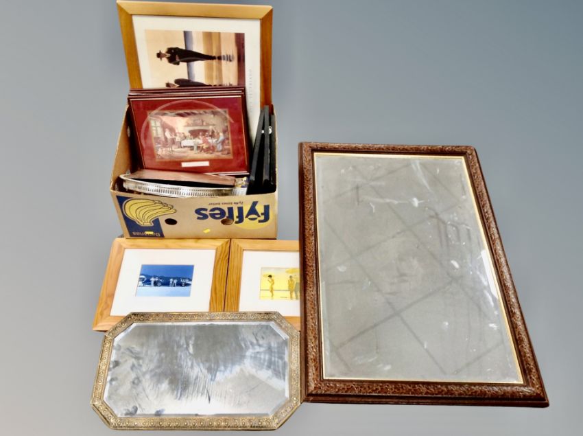 A contemporary overmantel mirror and a box of Jack Vettriano prints, bird pictures, brass and plated gallery trays, brass framed mirror etc
