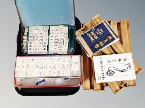 Two Mahjong sets in box and case, eight wooden counter stands