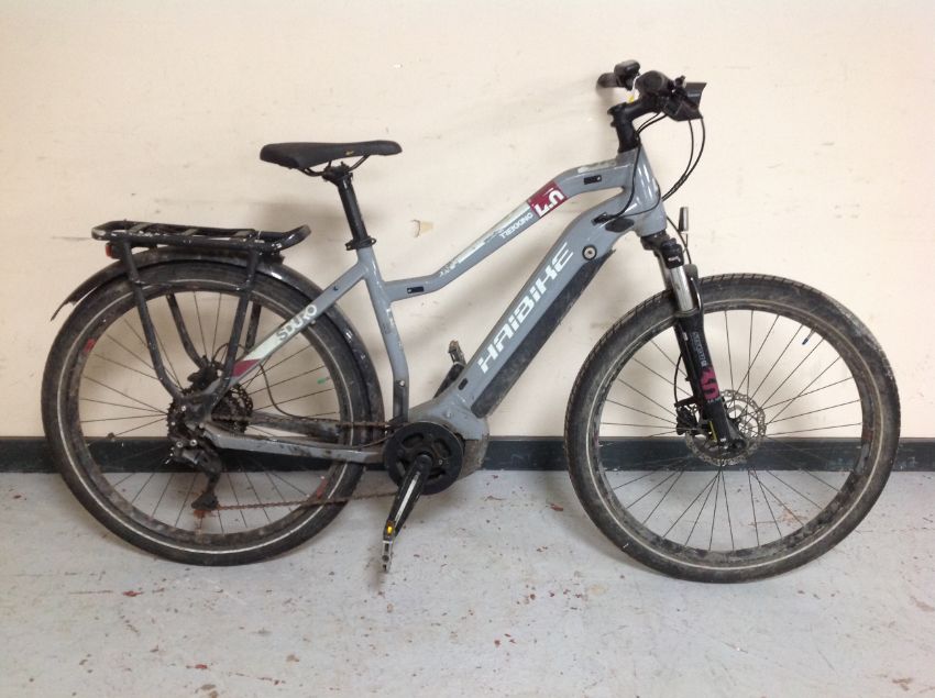 A Haibike trekking SDROUS electric front suspension mountain bike with rear pannier (no key or charger), 19 inch frame.