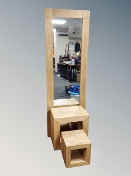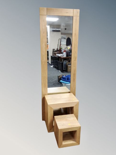 A contemporary oak hall mirror together with a nest of matching cube tables